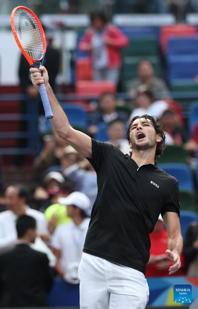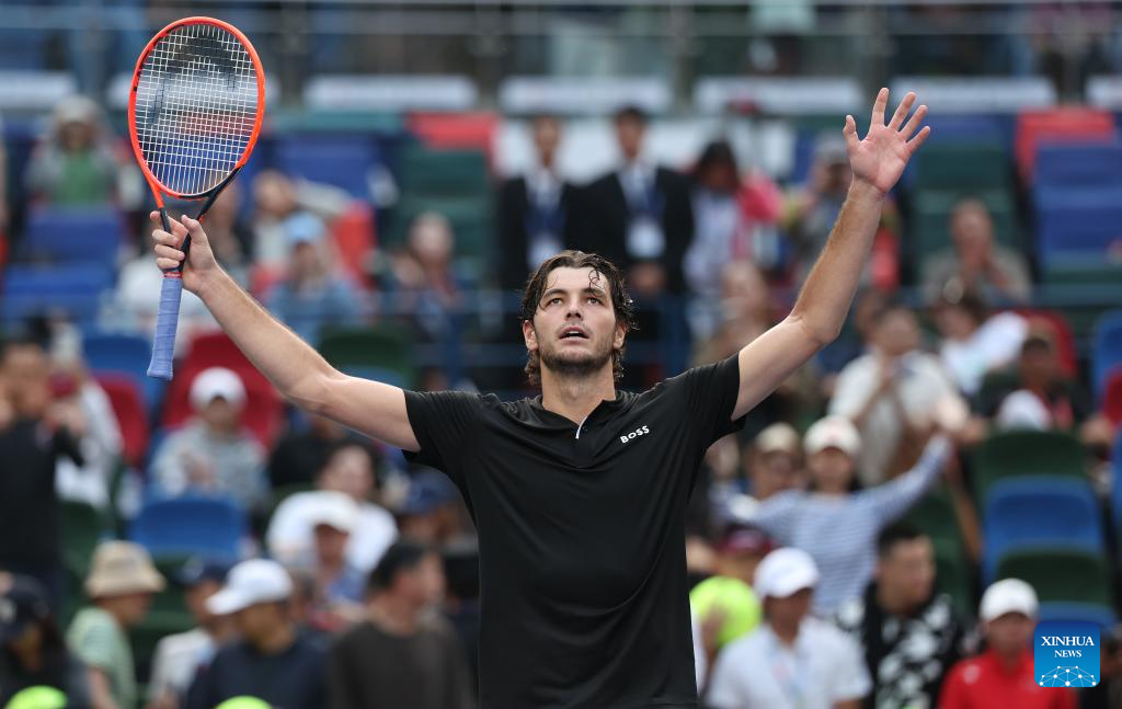 Taylor Fritz celebrates after the men's singles quarterfinal match between Taylor Fritz of the United States and David Goffin of Belgium at the ATP World Tour Shanghai Masters tennis tournament in Shanghai, east China, Oct. 11, 2024. (Xinhua/Bai Xuefei)