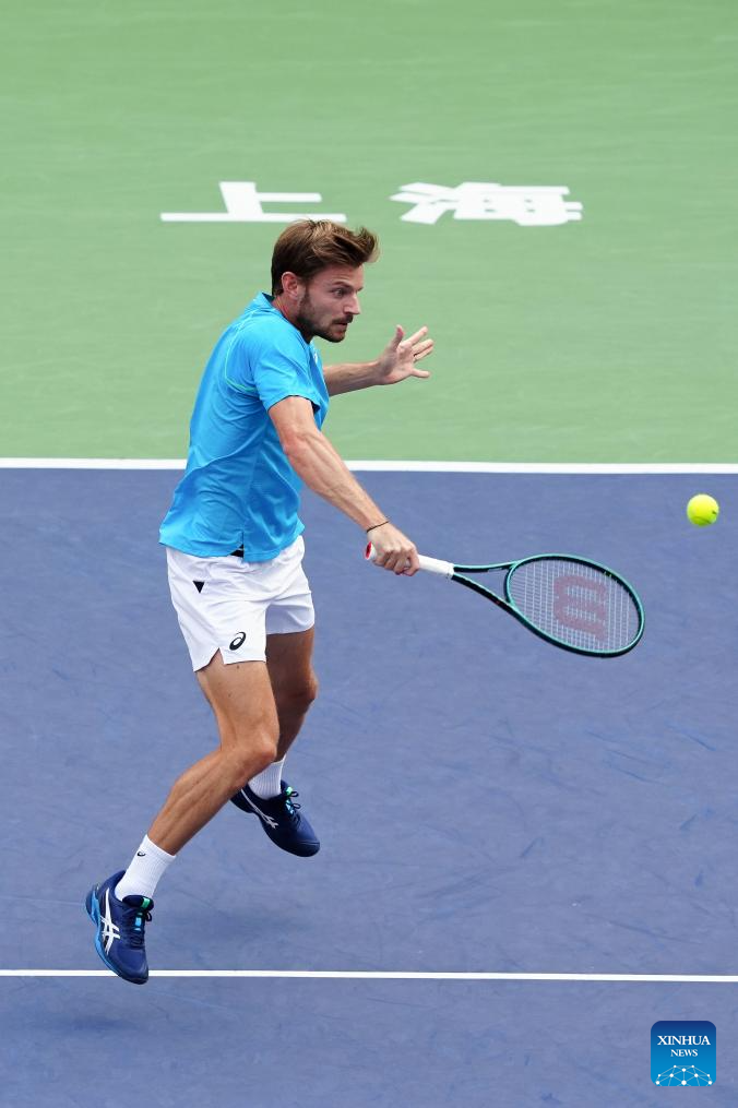 David Goffin hits a return during the men's singles quarterfinal match between Taylor Fritz of the United States and David Goffin of Belgium at the ATP World Tour Shanghai Masters tennis tournament in Shanghai, east China, Oct. 11, 2024. (Xinhua/Xu Yanan)