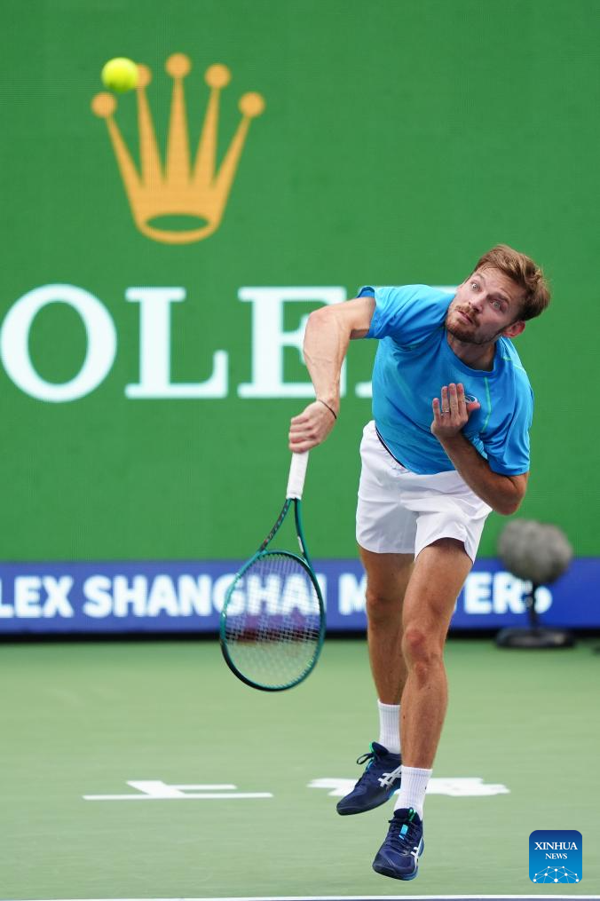 David Goffin serves during the men's singles quarterfinal match between Taylor Fritz of the United States and David Goffin of Belgium at the ATP World Tour Shanghai Masters tennis tournament in Shanghai, east China, Oct. 11, 2024. (Xinhua/Xu Yanan)