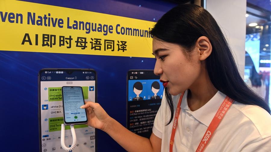 A visitor experiences an AI-driven native language communication device during the 21st China-ASEAN Expo at Nanning International Convention and Exhibition Center in Nanning, south China's Guangxi Zhuang Autonomous Region, Sept. 25, 2024. (Xinhua/Zhang Ailin)
