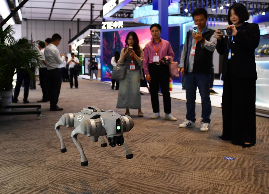 People watch a robot dog demonstration at an exhibition during the 2024 World Computing Conference in Changsha, central China's Hunan Province, Sept. 24, 2024. (Xinhua/Chen Zhenhai)