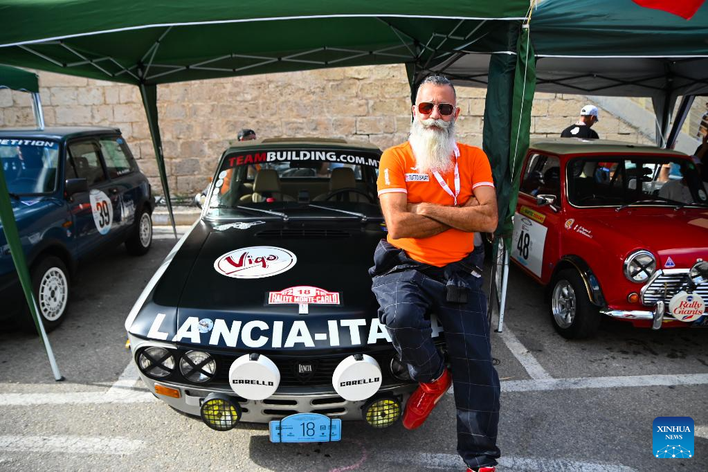 A man poses for photos with classic cars during the Mdina Grand Prix in Mdina, Malta, Oct. 12, 2024. The 14th edition of Classic Mdina Grand Prix is being held between Thursday and Sunday in Mdina. (Photo by Jonathan Borg/Xinhua)