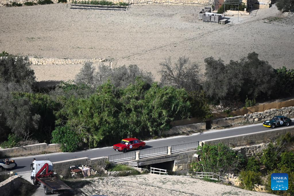 Classic cars race on the road during the Mdina Grand Prix in Mdina, Malta, Oct. 12, 2024. The 14th edition of Classic Mdina Grand Prix is being held between Thursday and Sunday in Mdina. (Photo by Jonathan Borg/Xinhua)
