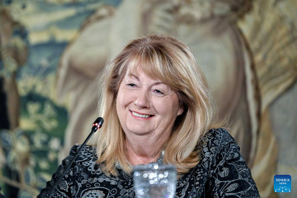 Vilija Blinkeviciute, leader of the Social Democratic Party, attends a press conference in Vilnius, Lithuania, Oct. 14, 2024. Lithuanian Social Democratic Party won the first round of the parliamentary elections, securing 19.36 percent of votes and 18 out of 70 seats, preliminary data from the Central Electoral Commission showed on Monday morning.