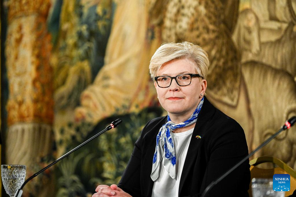 Lithuanian Prime Minister Ingrida Simonyte, member of Homeland Union-Lithuanian Christian Democrats, attends a press conference in Vilnius, Lithuania, Oct. 14, 2024. Lithuanian Social Democratic Party won the first round of the parliamentary elections, securing 19.36 percent of votes and 18 out of 70 seats, preliminary data from the Central Electoral Commission showed on Monday morning.