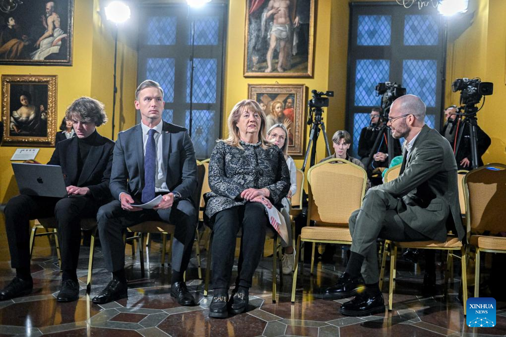 Vilija Blinkeviciute (3rd L), leader of the Social Democratic Party, attends a press conference in Vilnius, Lithuania, Oct. 14, 2024. Lithuanian Social Democratic Party won the first round of the parliamentary elections, securing 19.36 percent of votes and 18 out of 70 seats, preliminary data from the Central Electoral Commission showed on Monday morning.