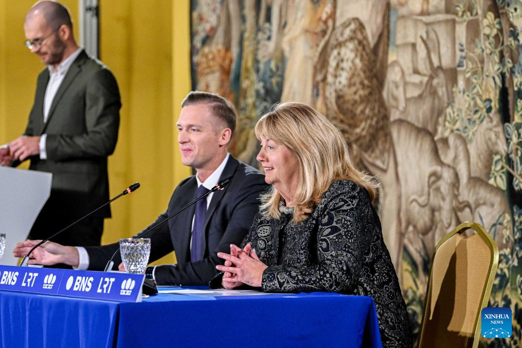 Vilija Blinkeviciute (1st R), leader of the Social Democratic Party, attends a press conference in Vilnius, Lithuania, Oct. 14, 2024. Lithuanian Social Democratic Party won the first round of the parliamentary elections, securing 19.36 percent of votes and 18 out of 70 seats, preliminary data from the Central Electoral Commission showed on Monday morning. The ruling conservative Homeland Union-Lithuanian Christian Democrats won 17.96 percent of the vote and 17 seats in the parliament. (Photo by Alfredas Pliadis/Xinhua)