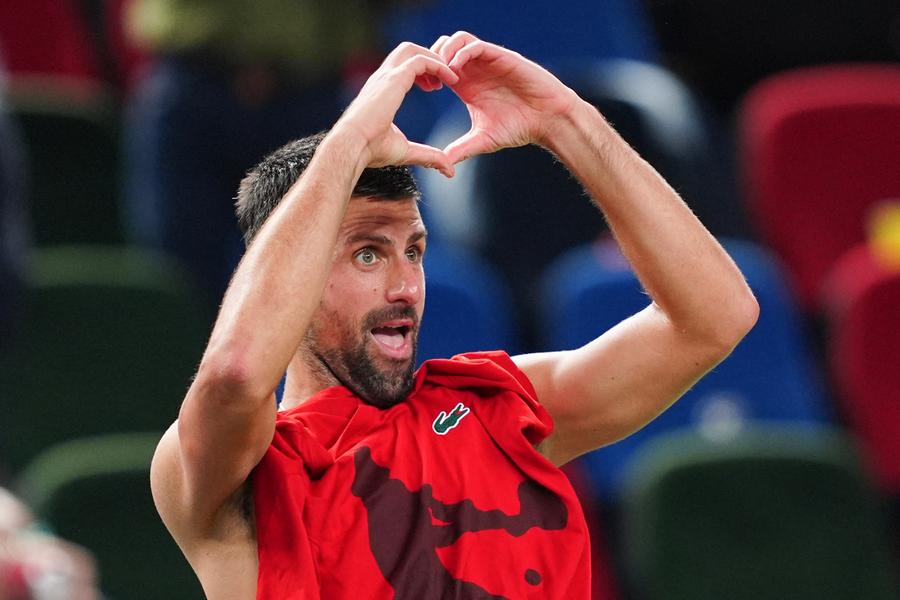 SHANGHAI, Oct. 14 (Xinhua) -- Dressed in red from jersey to shoes, 37-year-old Novak Djokovic paid tribute to all the fans at Qizhong Forest Sports City Arena and wrote different Chinese characters on the camera lens after winning a match, continuing his routine of showing love for China at the ATP Shanghai Masters.