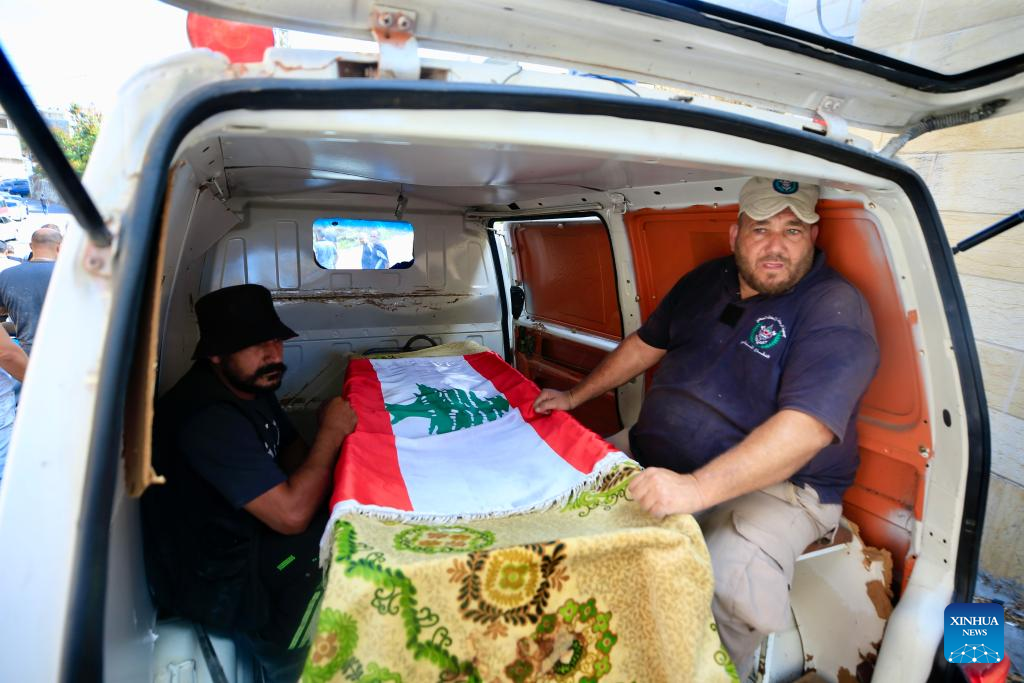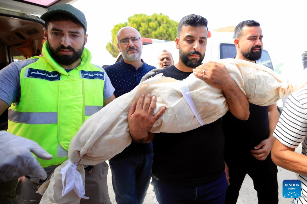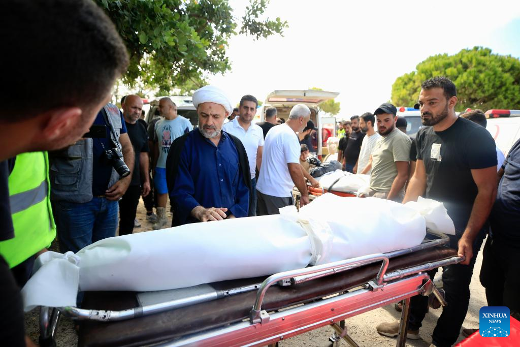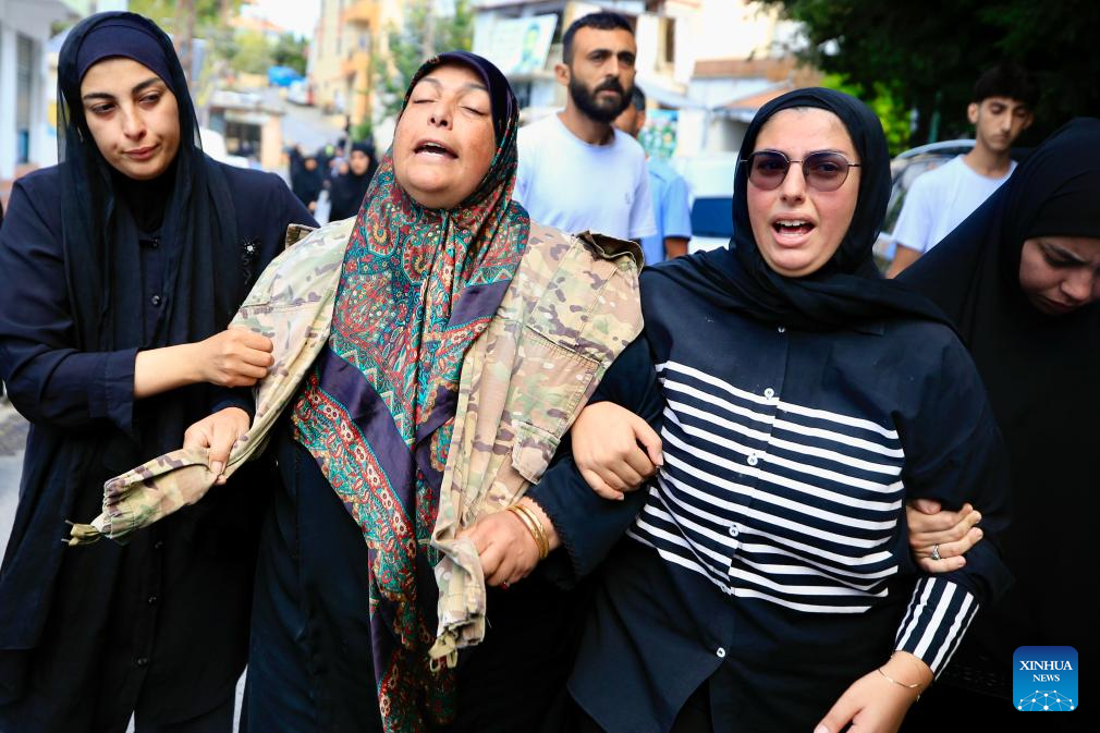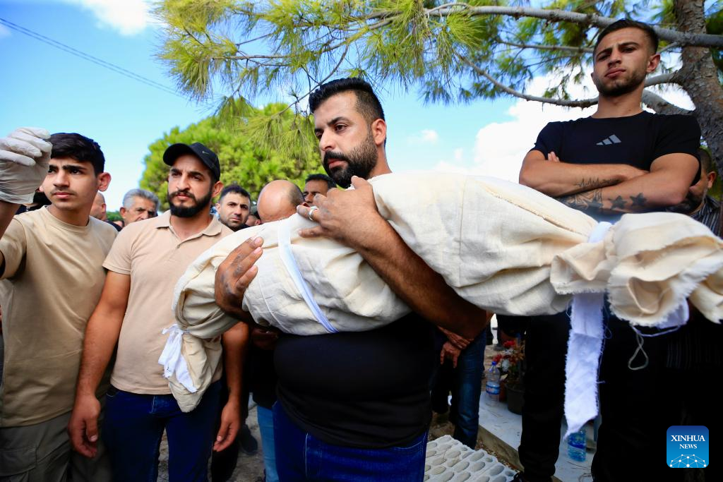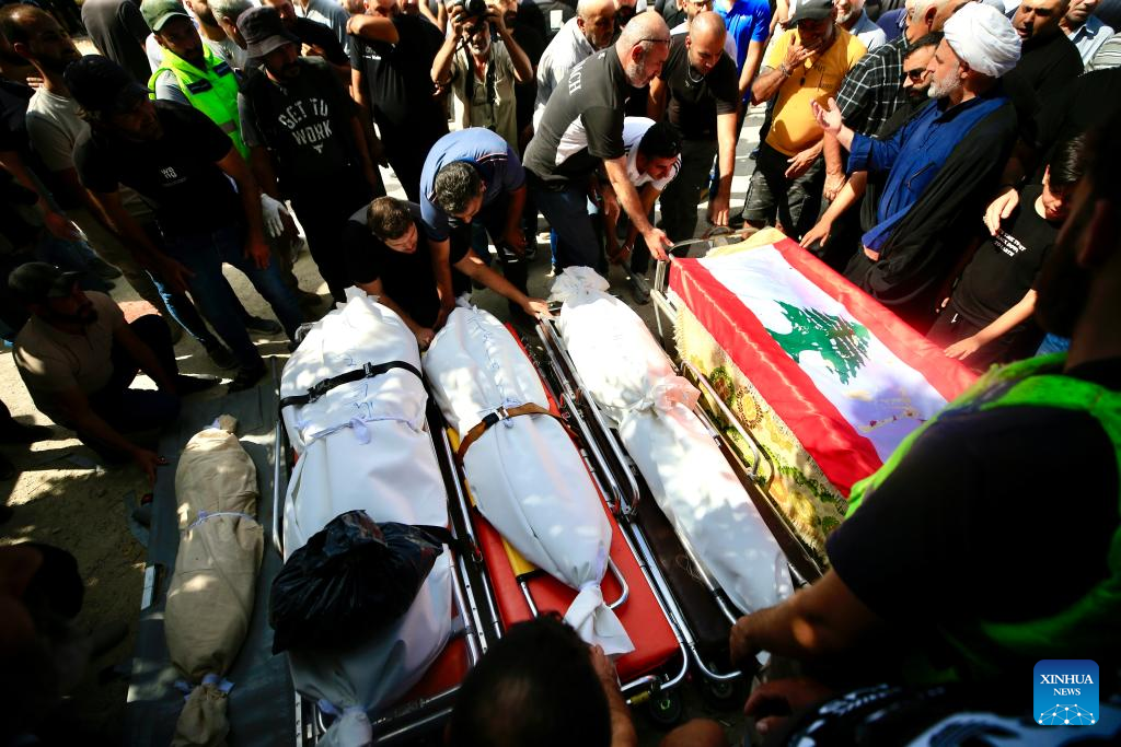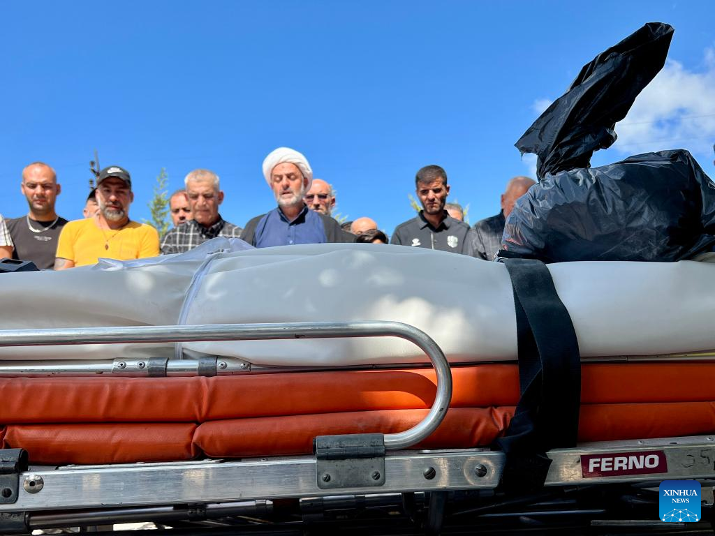 Lebanese people attend a funeral of victims killed in an Israeli airstrike in Baissariye, Lebanon, on Oct. 12, 2024. (Photo by Ali Hashisho/Xinhua)