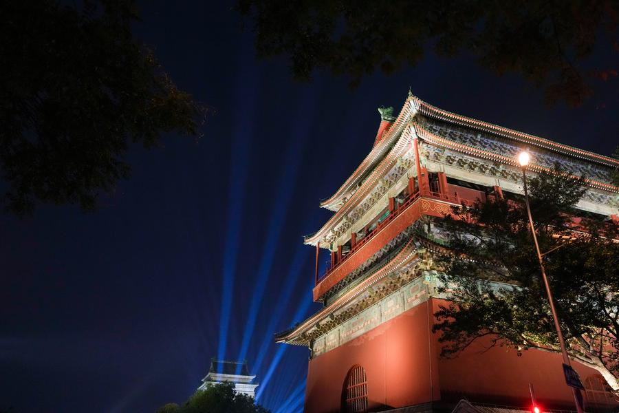 BEIJING, Oct. 14 (Xinhua) -- Located in the heart of Beijing, the Bell and Drum Towers Square bustles with activity as locals and tourists gather on a crisp October morning to explore the over 700-year-old historical site, while nearby residents engage in morning exercises and traditional games.
