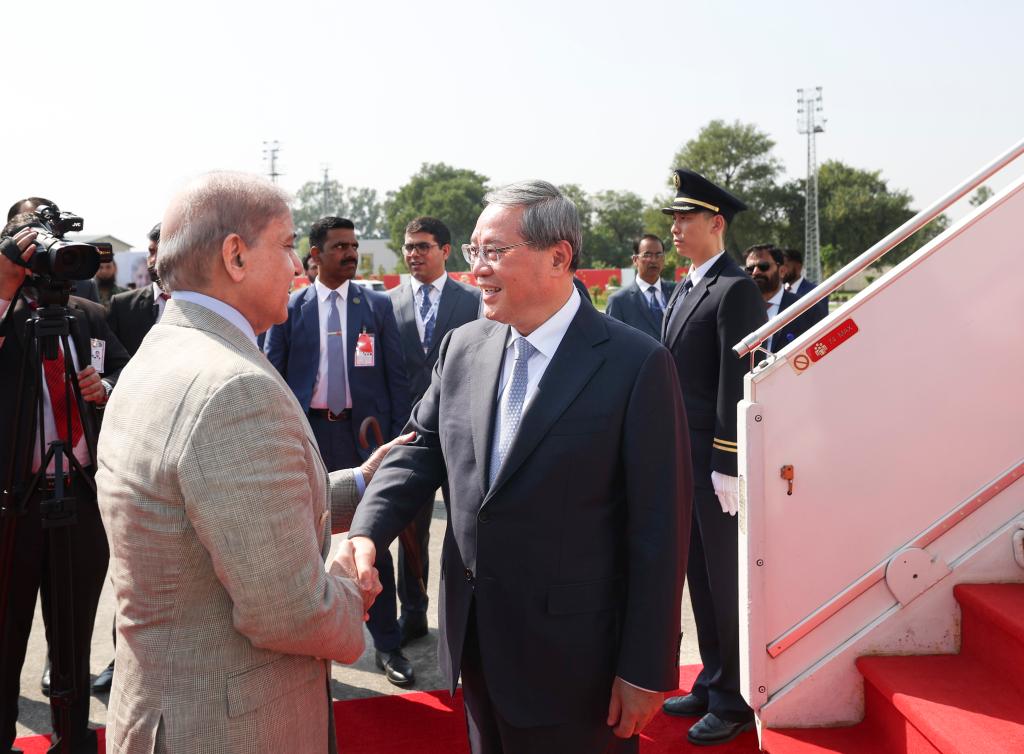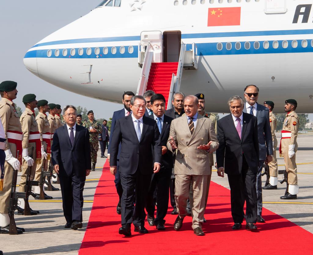 Chinese Premier Li Qiang arrives in Islamabad, Pakistan, Oct. 14, 2024, to attend the 23rd Meeting of the Council of Heads of Government of Member States of the Shanghai Cooperation Organization. During his stay, Li will also pay an official visit to the country. (Xinhua/Ding Haitao)