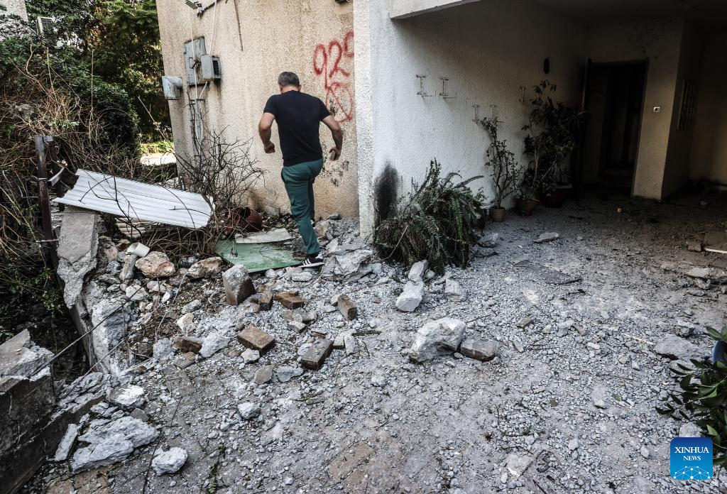 Photo taken on Oct. 15, 2024 shows the site damaged during a rocket attack in Kiryat Bialik, northern Israel. Lebanese military sources, who spoke anonymously, told Xinhua that Lebanese army sites monitored the launch of dozens of missiles from Lebanon into northern Israel. (JINI via Xinhua)