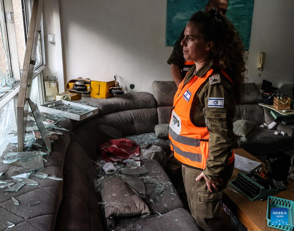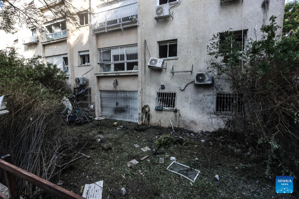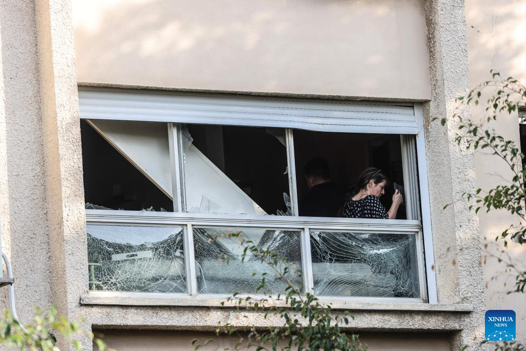 Photo taken on Oct. 15, 2024 shows a building damaged during a rocket attack in Kiryat Bialik, northern Israel. Lebanese military sources, who spoke anonymously, told Xinhua that Lebanese army sites monitored the launch of dozens of missiles from Lebanon into northern Israel. (JINI via Xinhua)