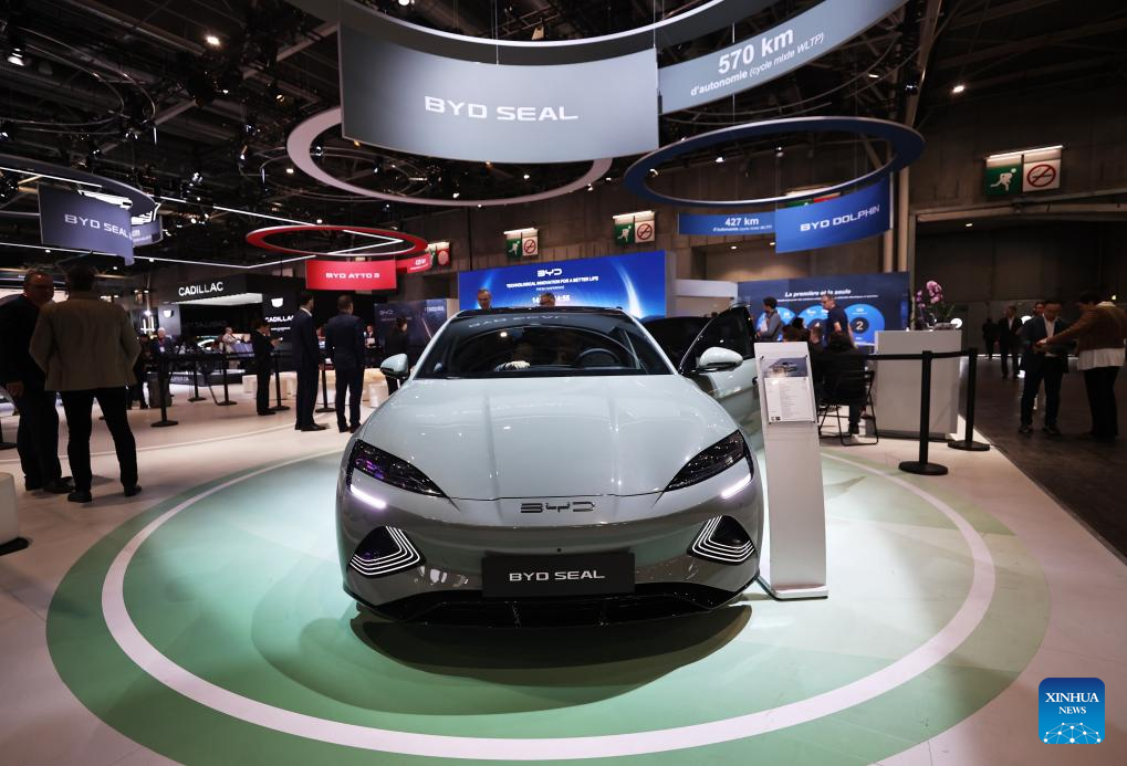 People visit the pavilion of Chinese carmaker BYD at the 2024 Paris Motor Show during the media day in Paris, France, Oct. 14, 2024. The 2024 Paris Motor Show kicked off here on Monday, which is expected to attract 500,000 visitors over its seven-day run. Nine Chinese electric vehicle (EV) manufacturers showcased their latest models at the show as they seek to expand their presence in the French and wider European markets. (Xinhua/Gao Jing)