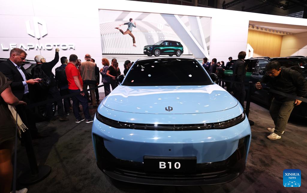 People visit the pavilion of Chinese carmaker Leapmotor at the 2024 Paris Motor Show during the media day in Paris, France, Oct. 14, 2024.