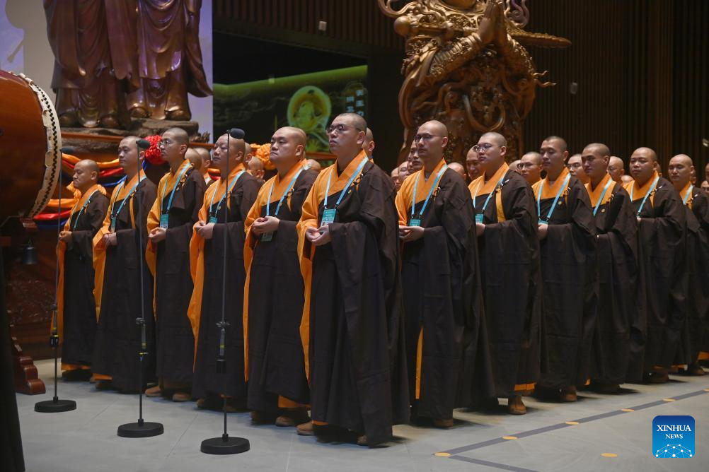 Members of the Buddhist community attend a dharma prayer service of the sixth World Buddhist Forum in Fenghua District of Ningbo, east China's Zhejiang Province, Oct. 16, 2024. The sixth World Buddhist Forum kicked off in Ningbo on Tuesday and about 800 representatives, experts and scholars from 72 countries and regions in the Buddhist community attended the forum. (Xinhua/Lin Guangyao)