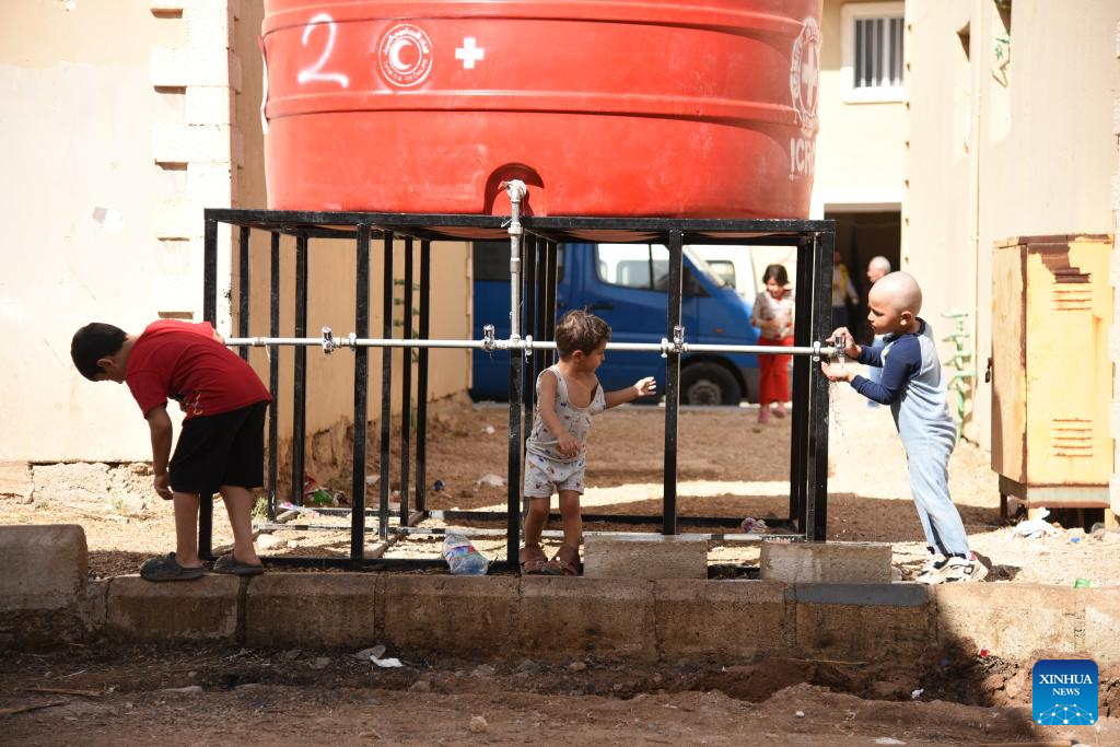 Children are pictured at a water distribution station of a displacement shelter in the countryside of Damascus, Syria, Oct. 15, 2024. (Photo by Hummam Sheikh Ali/Xinhua)