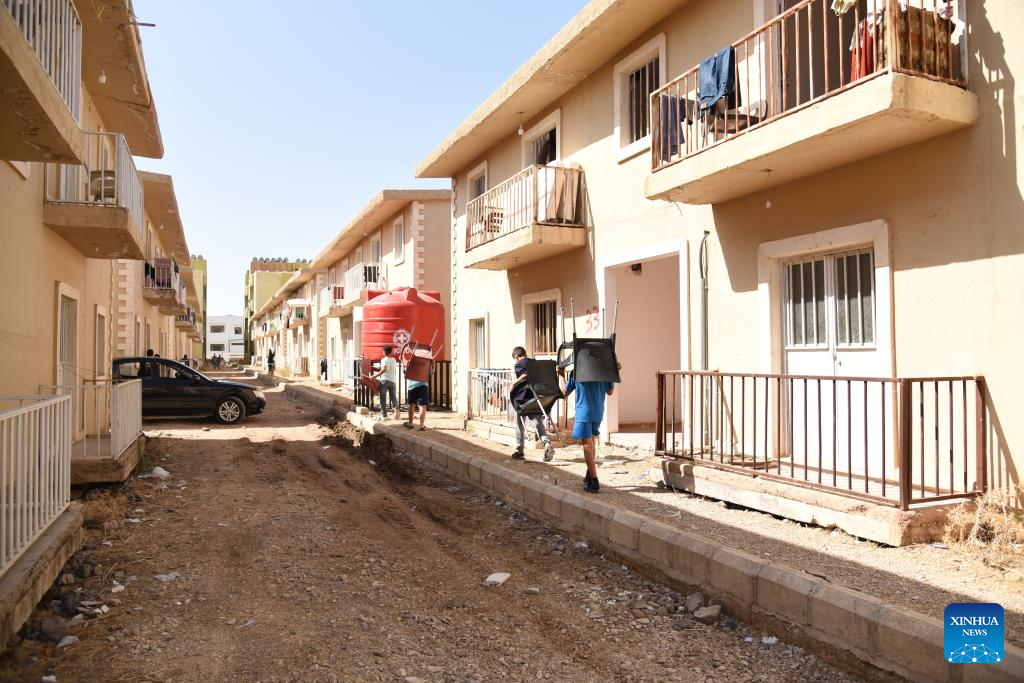 Lebanese people move furniture at a displacement shelter in the countryside of Damascus, Syria, Oct. 15, 2024. (Photo by Hummam Sheikh Ali/Xinhua)