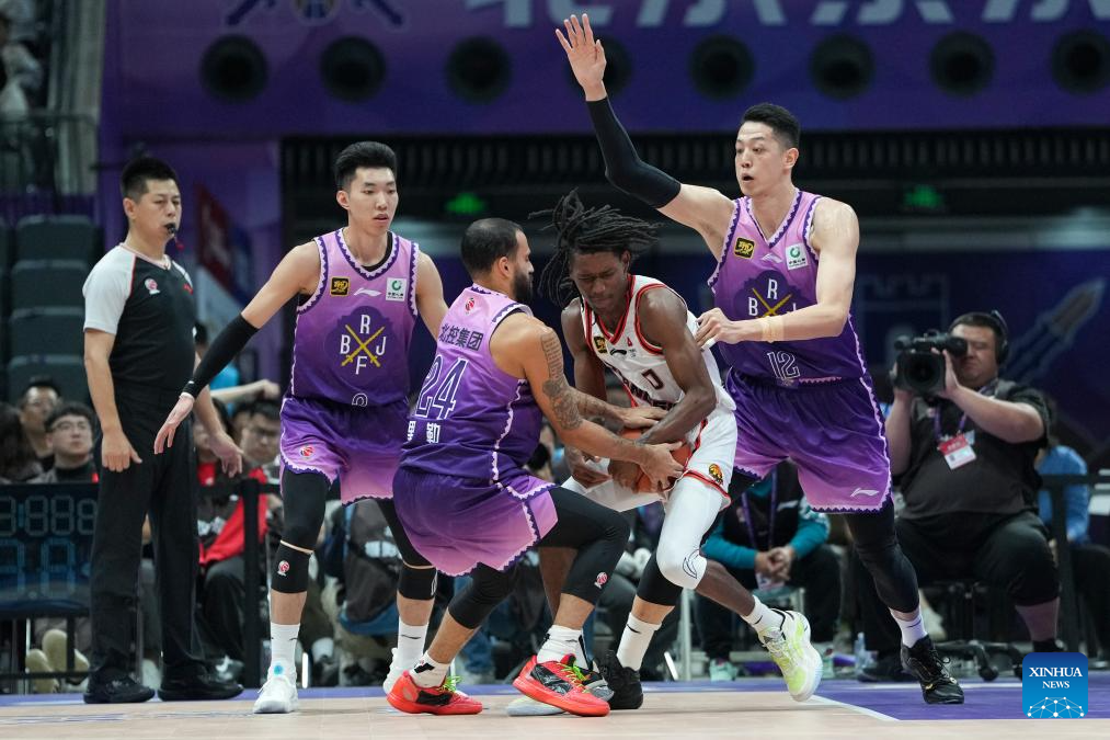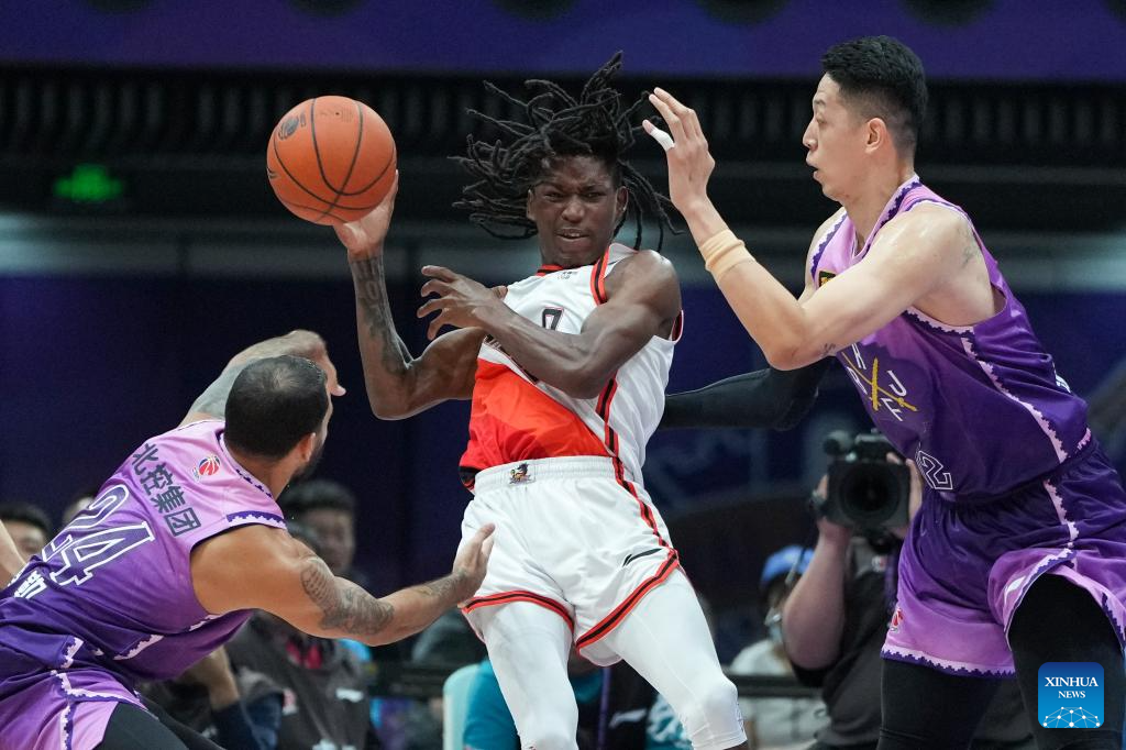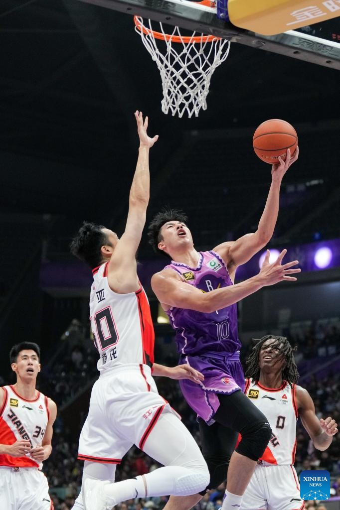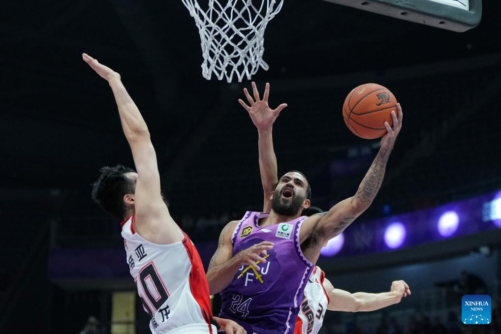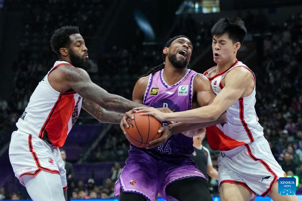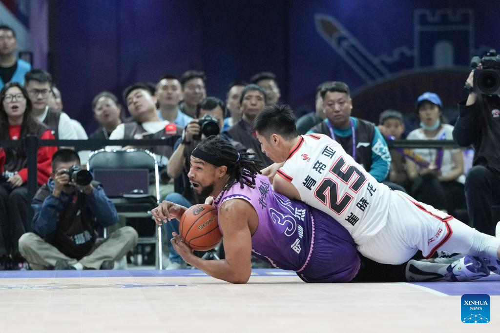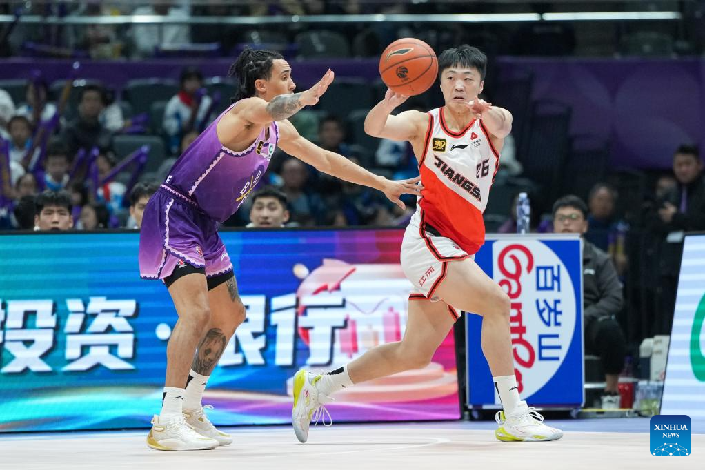 Grant Riller (R) of Beijing Royal Fighters goes for a basket during a match between Beijing Royal Fighters and Jiangsu Dragons at the 2024-2025 season of the Chinese Basketball Association (CBA) league in Beijing, China, Oct.15, 2024. (Xinhua/Ju Huanzong)