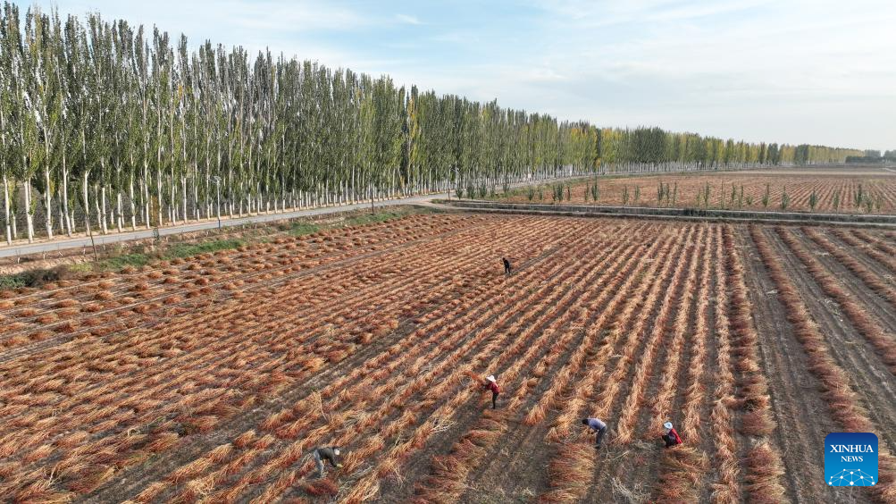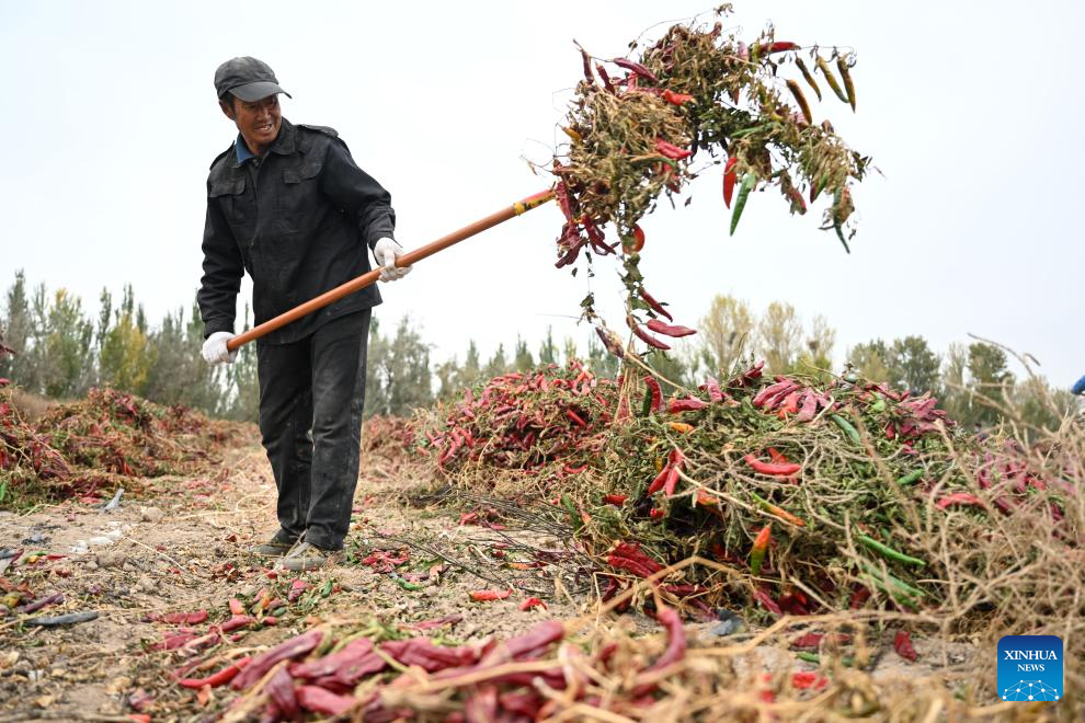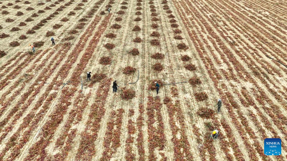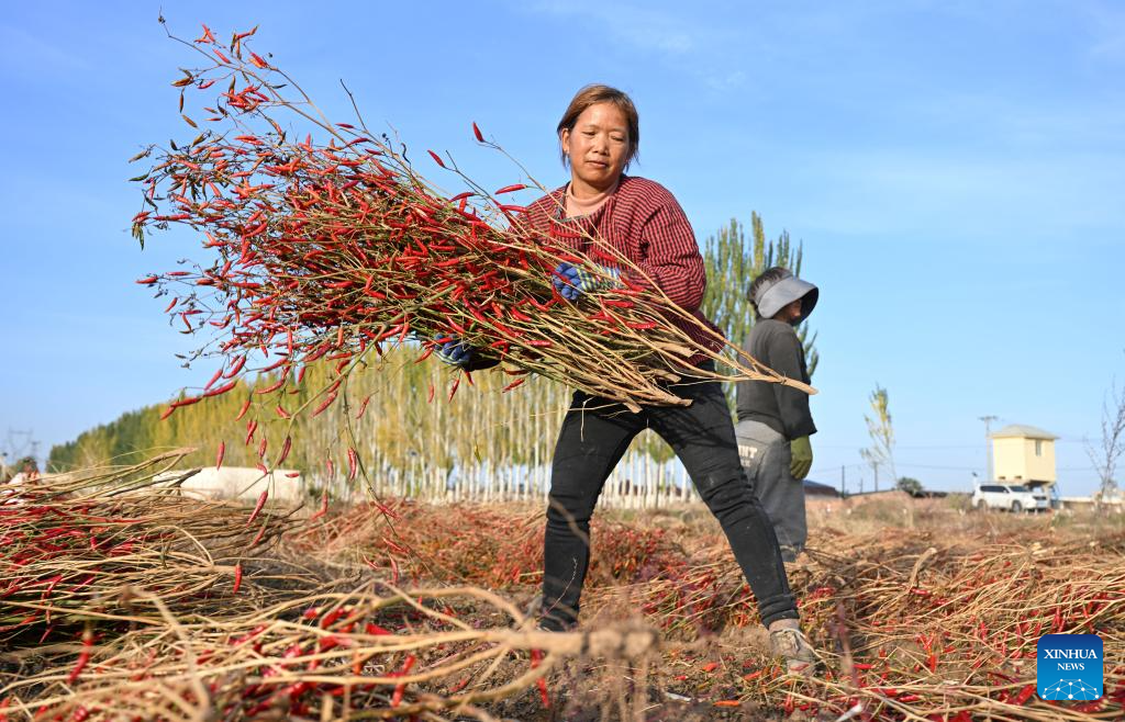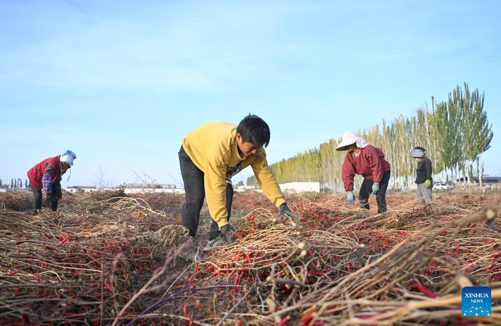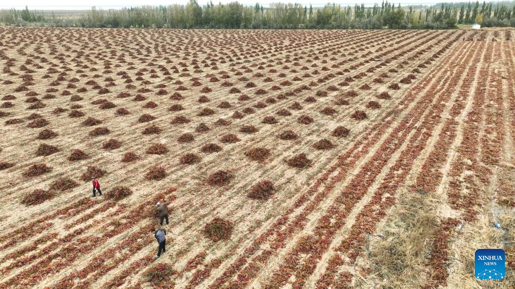 Farmers air chili peppers in a field in Linhe District of Bayannur, north China's Inner Mongolia Autonomous Region, Oct. 15, 2024. (Xinhua/Liu Lianfen)