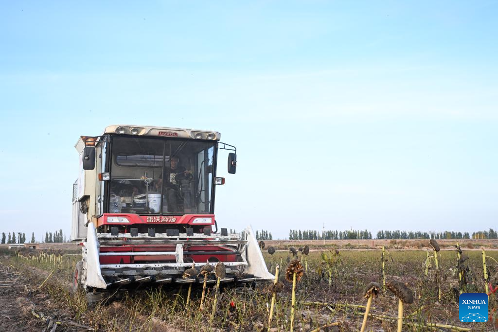 A farmer drives a harvester to harvest sunflower seeds in a field in Linhe District of Bayannur, north China's Inner Mongolia Autonomous Region, Oct. 15, 2024. (Xinhua/Liu Lianfen)