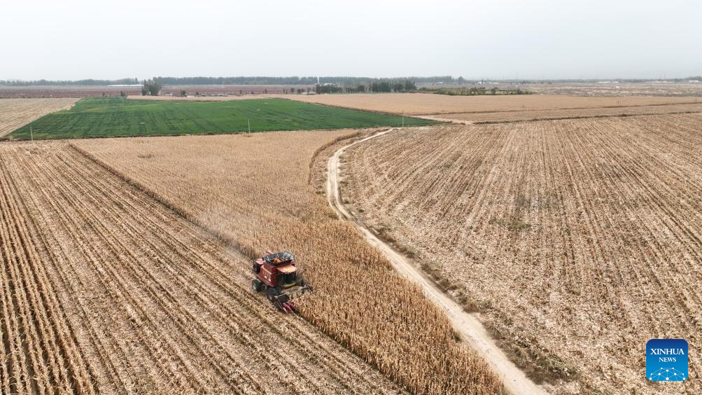 An aerial drone photo taken on Oct. 16, 2024 shows a farmer harvesting corns in a field in Urad Front Banner of Bayannur, north China's Inner Mongolia Autonomous Region. (Xinhua/Bei He)