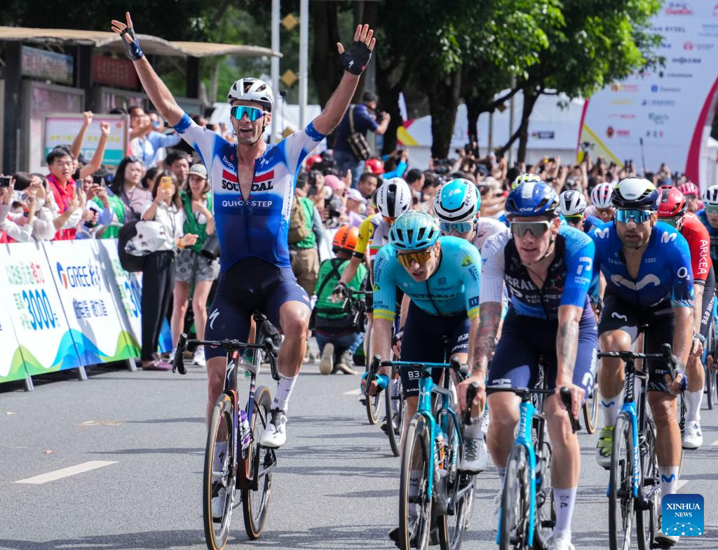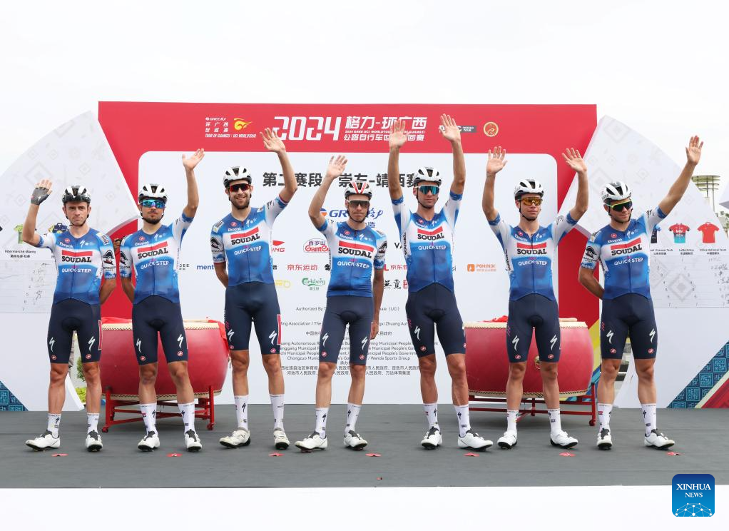 Team Soudal Quick-Step wave before the 2nd stage of Tour of Guangxi/UCI World Tour in Jingxi, south China's Guangxi Zhuang Autonomous Region, Oct. 16, 2024. (Xinhua/Jin Haoyuan)