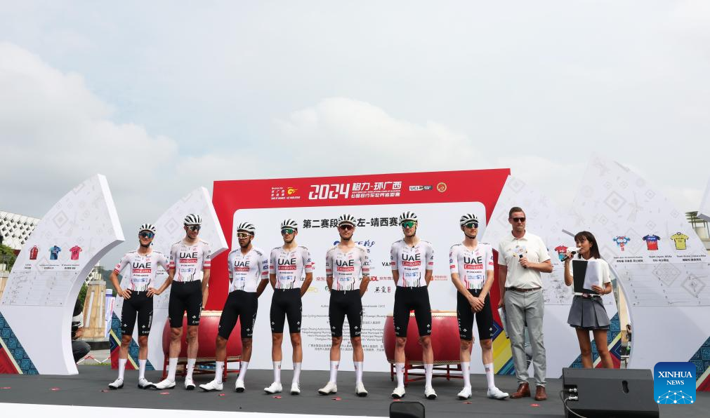 UAE Team Emirates pose before the 2nd stage of Tour of Guangxi/UCI World Tour in Jingxi, south China's Guangxi Zhuang Autonomous Region, Oct. 16, 2024. (Xinhua/Jin Haoyuan)