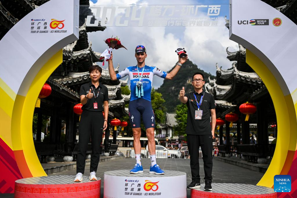Stage winner Warre Vangheluwec (C) of Belgium from Soudal Quick-Step celebrates during the awarding ceremony after the 2nd stage of Tour of Guangxi/UCI World Tour in Jingxi, south China's Guangxi Zhuang Autonomous Region, Oct. 16, 2024. (Xinhua/Jin Haoyuan)