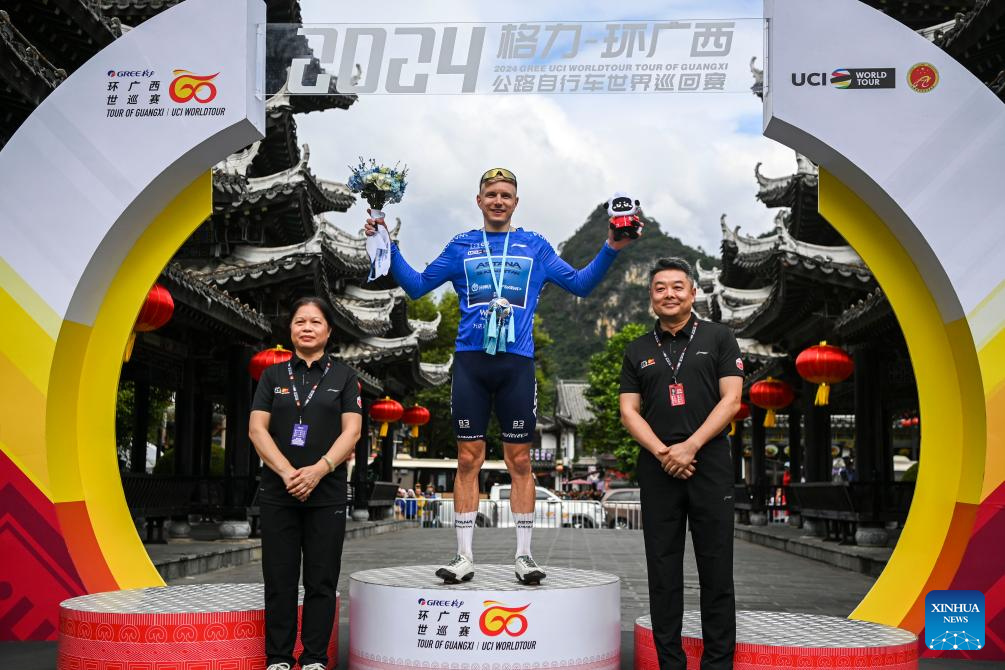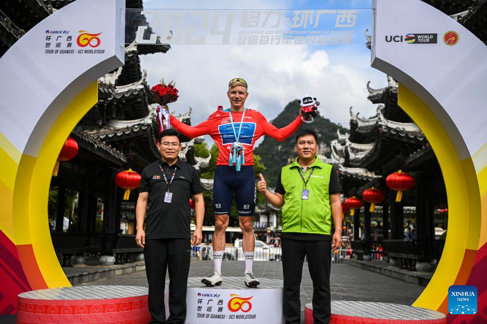 Max Kanter (C) of Germany from Astana Qazaqstan Team celebrates during the awarding ceremony after the 2nd stage of Tour of Guangxi/UCI World Tour in Jingxi, south China's Guangxi Zhuang Autonomous Region, Oct. 16, 2024. (Xinhua/Jin Haoyuan)