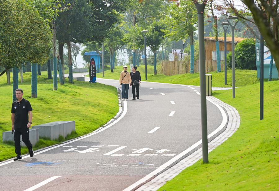 People walk on a bank road of the Sanjiangkou Yangtze River Park in Yibin City, southwest China's Sichuan Province, Oct. 13, 2024. (Xinhua/Li He)