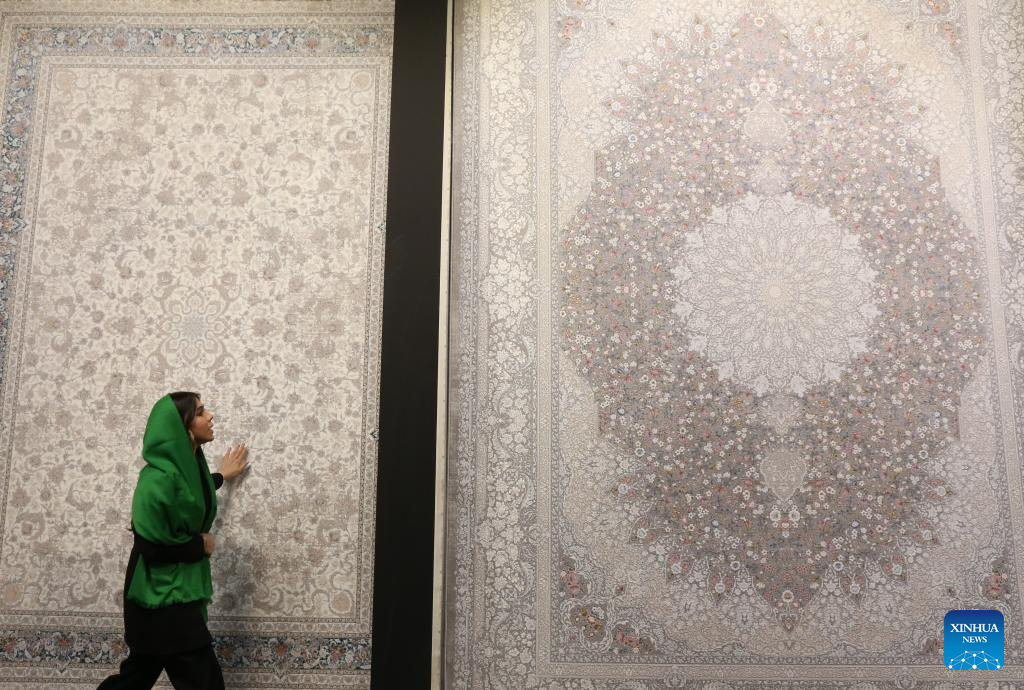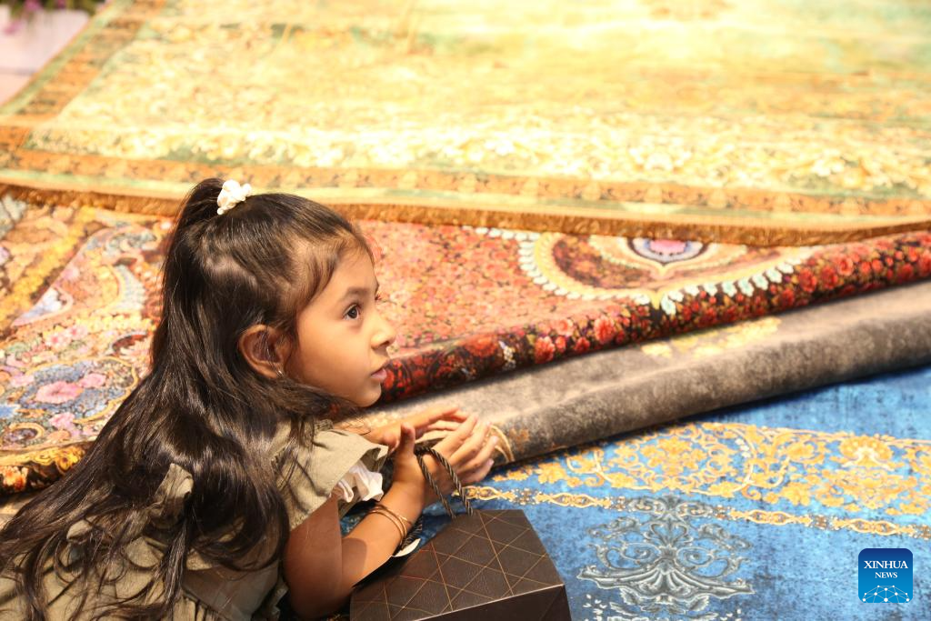 A girl visits the 16th International Floor Coverings, Moquette, Machine-Made Carpet and Related Industries Exhibition in Tehran, Iran, Oct. 17, 2024. The exhibition was held in Tehran from Monday to Thursday. (Xinhua/Shadati)