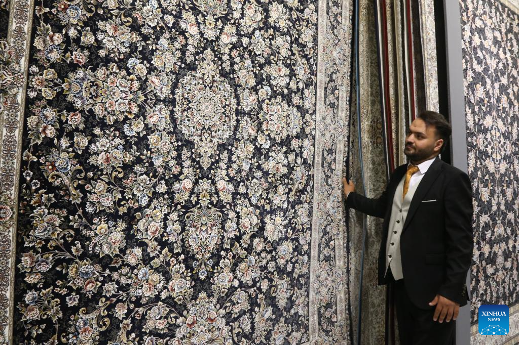 A staff member displays products during the 16th International Floor Coverings, Moquette, Machine-Made Carpet and Related Industries Exhibition in Tehran, Iran, Oct. 17, 2024. The exhibition was held in Tehran from Monday to Thursday. (Xinhua/Shadati)