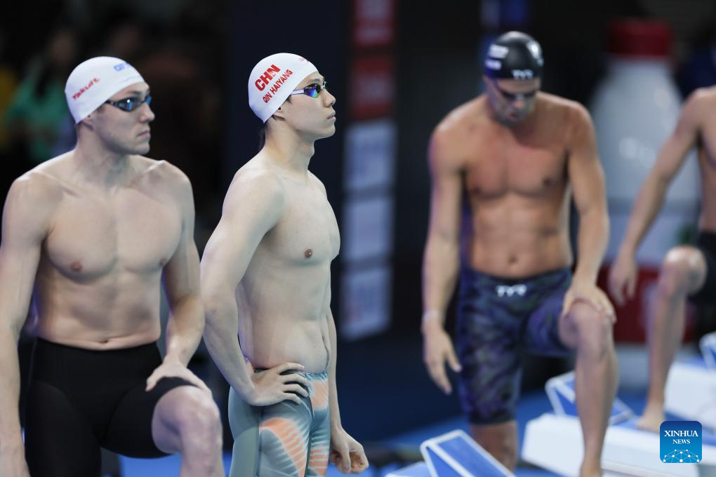 Qin Haiyang of China reacts before the men's 50m breaststroke final at the World Aquatics Swimming World Cup 2024 in Shanghai, China, Oct. 19, 2024. (Xinhua/Wang Xiang)