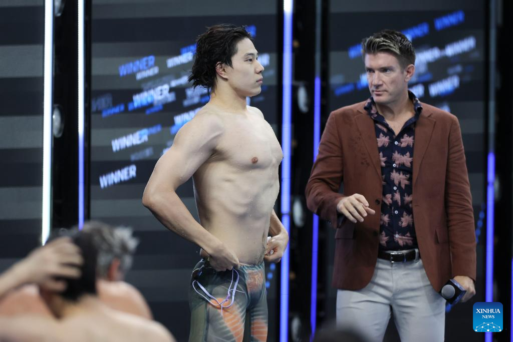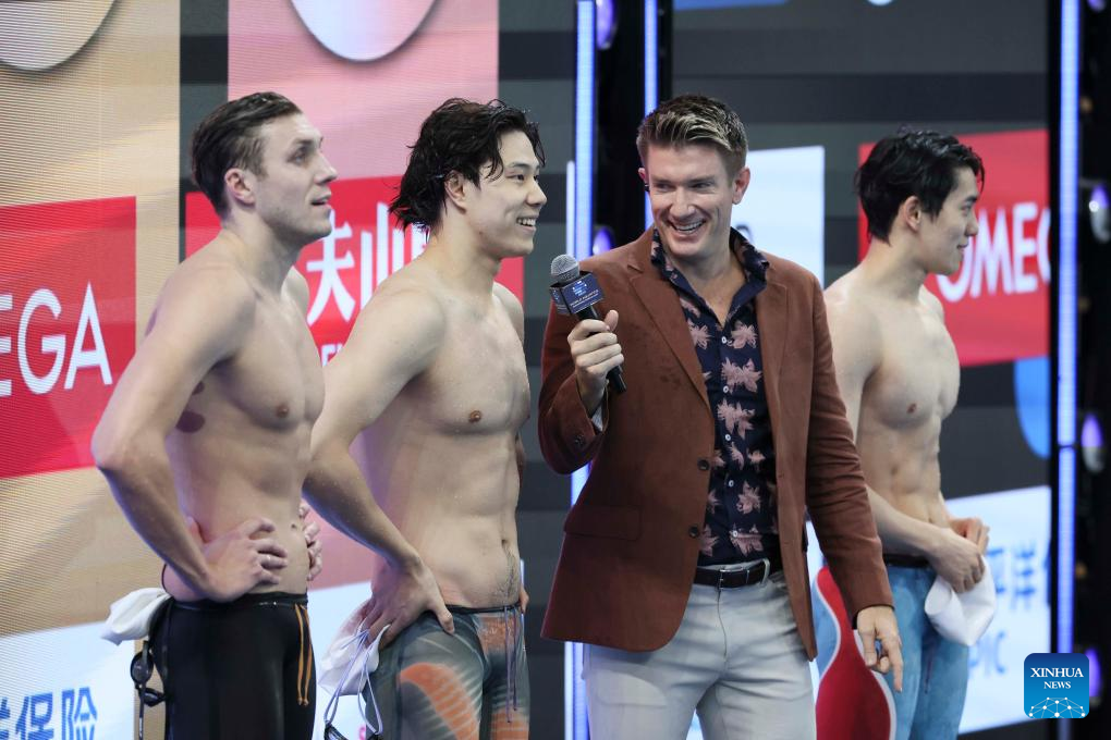 Qin Haiyang (2nd L)of China reacts after the men's 50m breaststroke final at the World Aquatics Swimming World Cup 2024 in Shanghai, China, Oct. 19, 2024. (Xinhua/Wang Xiang)