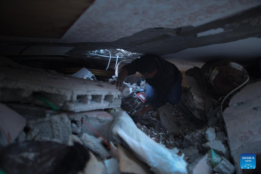 A Palestinian searches for survivors in the rubble after Israeli attacks in the Al-Maghazi refugee camp in central Gaza Strip, Oct. 19, 2024.