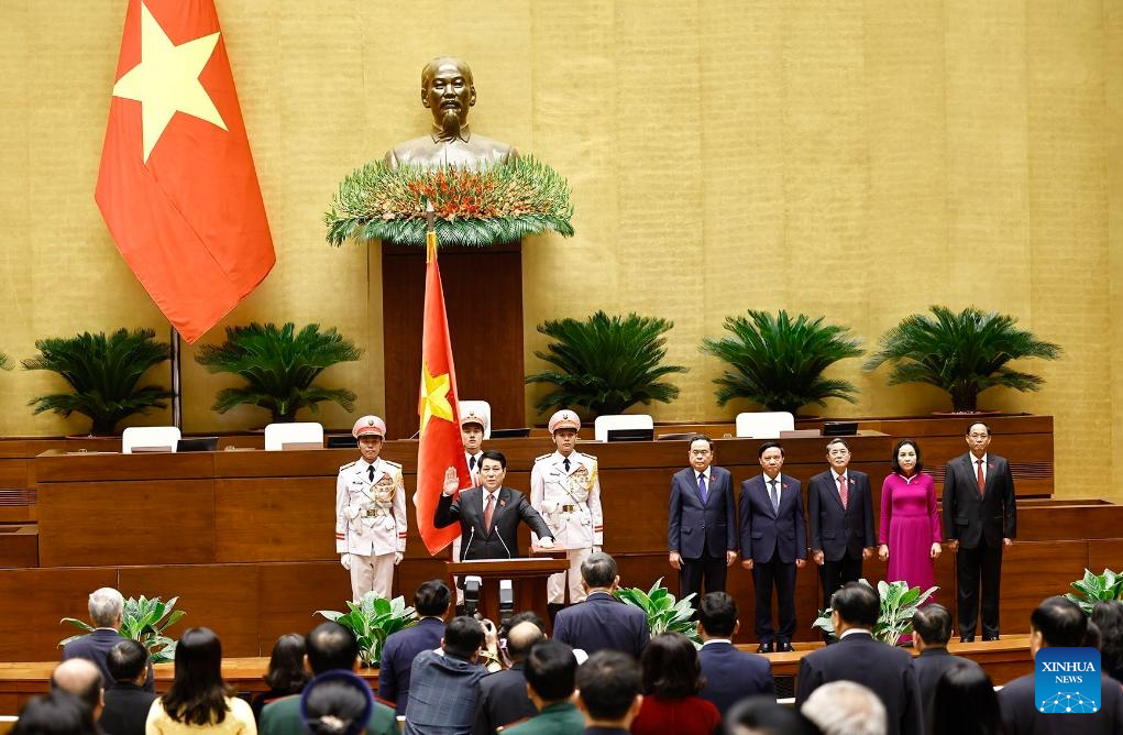 Luong Cuong attends a swearing-in ceremony in Hanoi, Vietnam, Oct. 21, 2024. Luong Cuong, member of the Political Bureau of the Communist Party of Vietnam (CPV) Central Committee and permanent member of the CPV Central Committee Secretariat, was elected as Vietnam's president on Monday, local media reported. (VNA/Handout via Xinhua)
