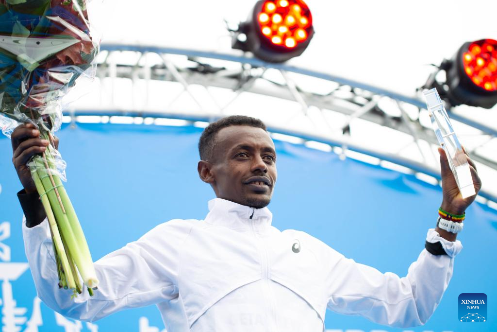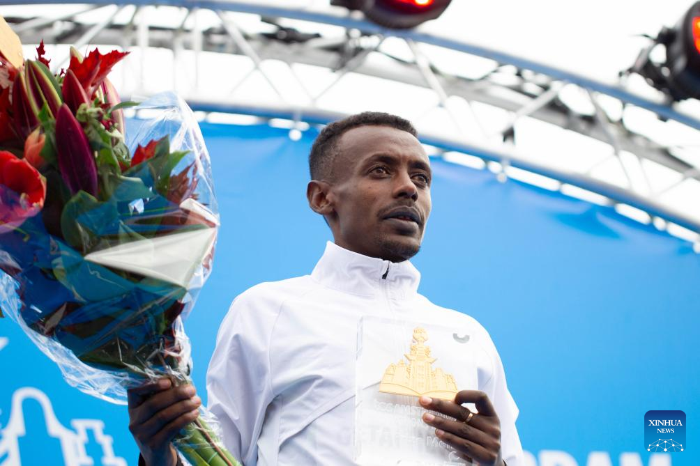 Tsegaye Getachew of Ethiopia reacts on the awarding podium after winning the men's race during the 48th edition of the Amsterdam Marathon in Amsterdam, the Netherlands, Oct. 20, 2024. (Photo by Sylvia Lederer/Xinhua)