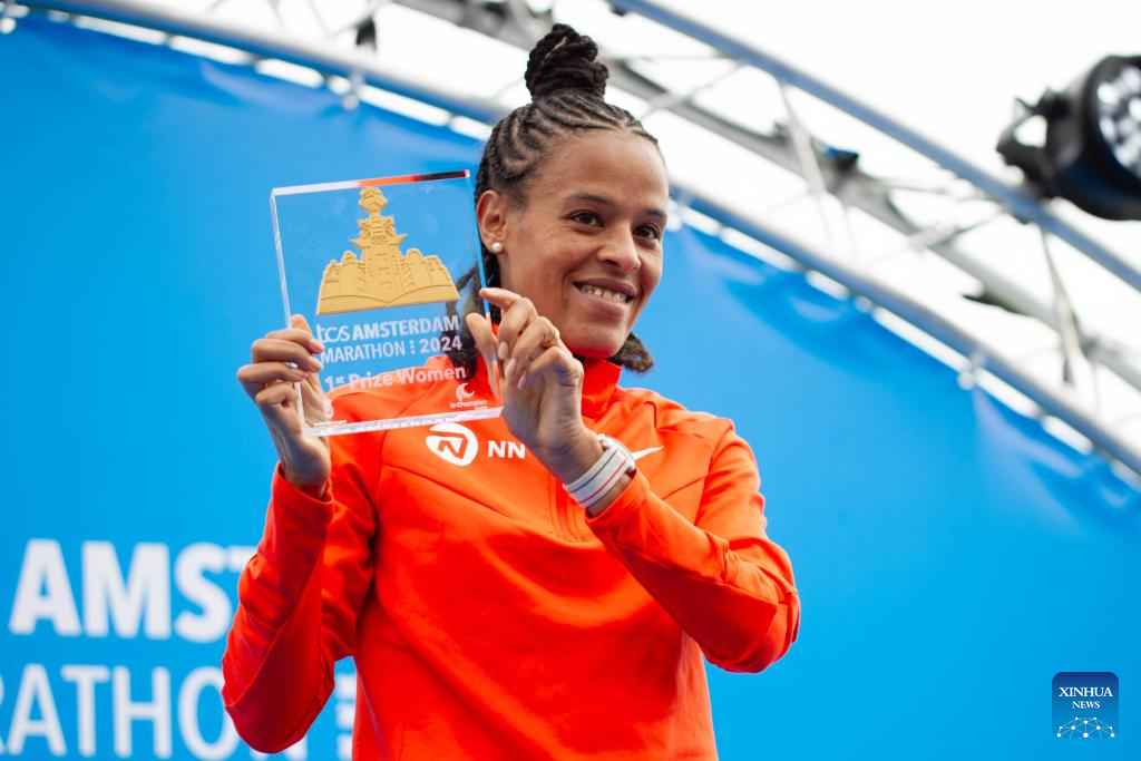 Yalemzerf Yehualaw of Ethiopia displays her trophy on the awarding podium after winning the women's race during the 48th edition of the Amsterdam Marathon in Amsterdam, the Netherlands, Oct. 20, 2024. (Photo by Sylvia Lederer/Xinhua)