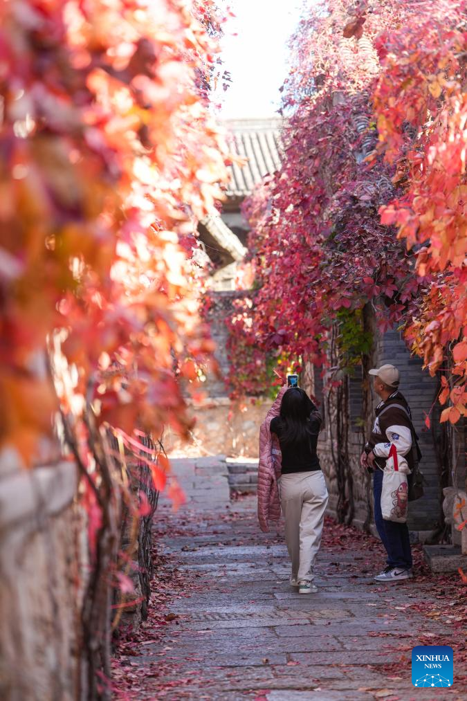 A tourist takes pictures of autumn leaves in the Gubei Water Town in Beijing, capital of China, Oct. 20, 2024. (Xinhua/Chen Yehua)