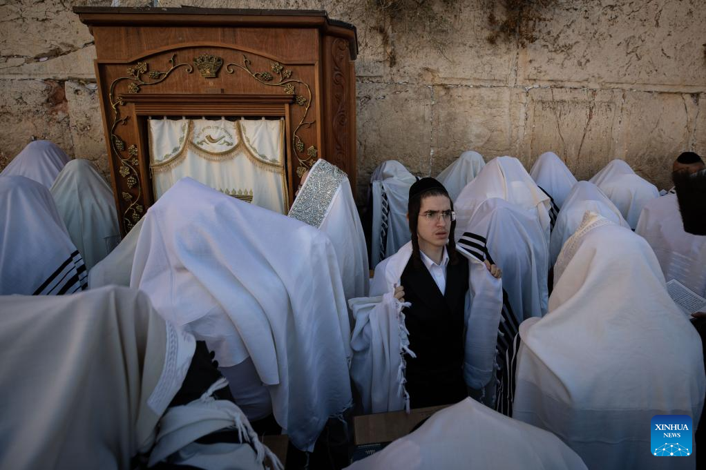Jewish worshipers gather to perform the annual Cohanim prayer during the Jewish holiday of Sukkot, at the Western Wall in the old city of Jerusalem, Oct. 20, 2024. (Xinhua/Chen Junqing)