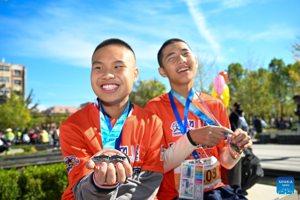 Visually impaired runners Yuan Jiale (R) and Huang Zimao show their medals after finishing the 5km race with their guides in Tianjin Marathon 2024 in north China's Tianjin, Oct. 20, 2024. (Xinhua/Sun Fanyue)