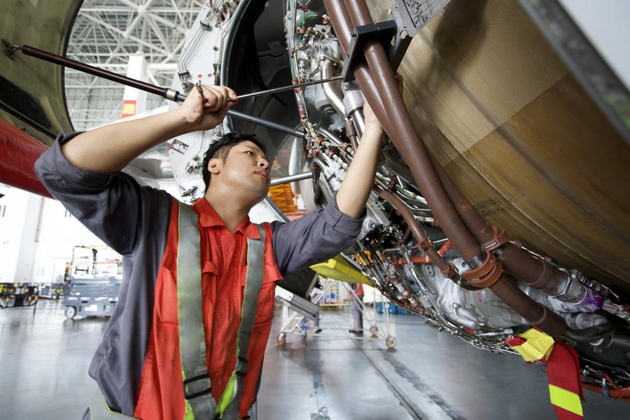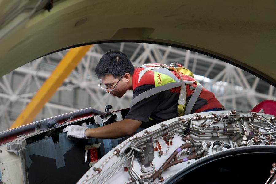 Workers of HNA Technic maintain an inbound airplane at the one-stop aircraft maintenance base of Hainan Free Trade Port in Haikou, south China's Hainan Province, Oct. 21, 2024. (Xinhua/Zhang Liyun)A worker of HNA Technic maintains an inbound airplane at the one-stop aircraft maintenance base of Hainan Free Trade Port in Haikou, south China's Hainan Province, Oct. 21, 2024. (Xinhua/Zhang Liyun)Workers of HNA Technic maintain an inbound airplane at the one-stop aircraft maintenance base of Hainan Free Trade Port in Haikou, south China's Hainan Province, Oct. 21, 2024. (Xinhua/Zhang Liyun)A worker of HNA Technic changes an engine part for an inbound airplane at the one-stop aircraft maintenance base of Hainan Free Trade Port in Haikou, south China's Hainan Province, Oct. 21, 2024. (Xinhua/Zhang Liyun)Workers of HNA Technic conduct pre-painting cleaning for an inbound airplane at the one-stop aircraft maintenance base of Hainan Free Trade Port in Haikou, south China's Hainan Province, Oct. 21, 2024. (Xinhua/Zhang Liyun)■