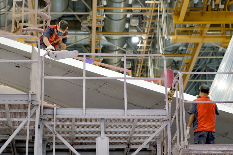 Workers of HNA Technic remove the original paint on an inbound airplane at the one-stop aircraft maintenance base of Hainan Free Trade Port in Haikou, south China's Hainan Province, Oct. 21, 2024. (Xinhua/Zhang Liyun)