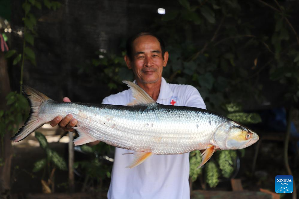 This undated photo shows a man displaying a giant salmon carp in Cambodia. The "Mekong ghost" fish has resurfaced in Cambodia after nearly two decades without a trace, said a news release on Tuesday. The elusive giant salmon carp (Aaptosyax grypus) has been spotted once again in the waters of Cambodia by a team of international scientists led by the Fisheries Administration under the Cambodian Ministry of Agriculture, Forestry and Fisheries, according to the news release. (Chhut Chheana/Wonders of the Mekong/Handout via Xinhua)