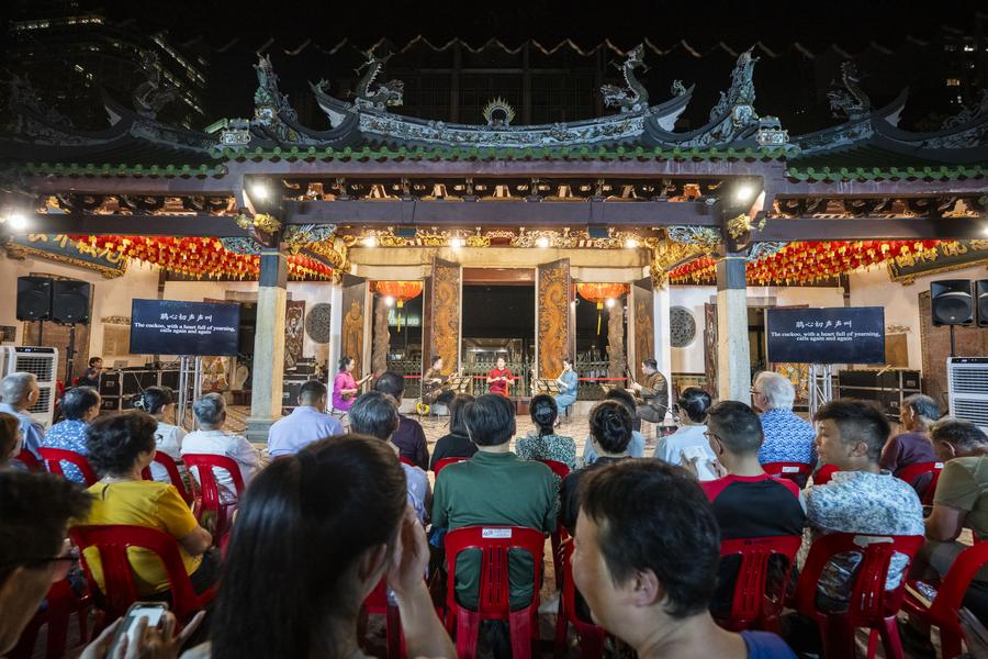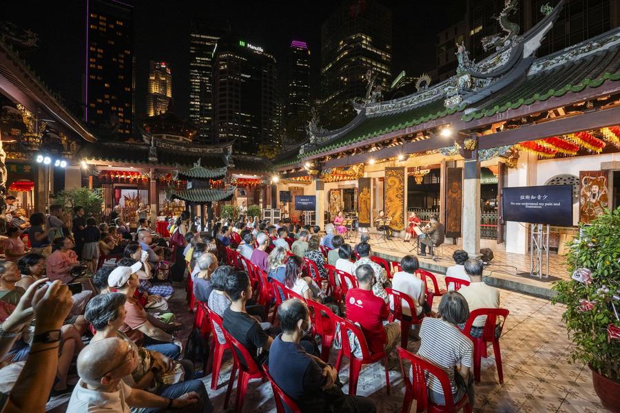 People enjoy a Nanyin concert performed by Siong Leng Musical Association at the Thian Hock Keng Temple, Singapore, Oct. 21, 2024. (Then Chih Wey/Xinhua)