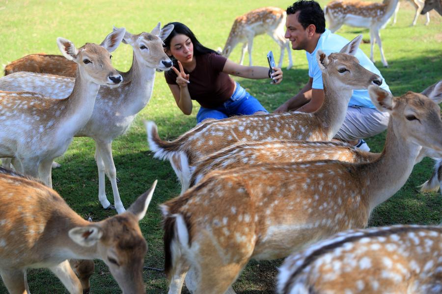 A tourist takes selfies with deer at Africa Safari Park in Alexandria, Egypt, Oct. 21, 2024. (Xinhua/Sui Xiankai)