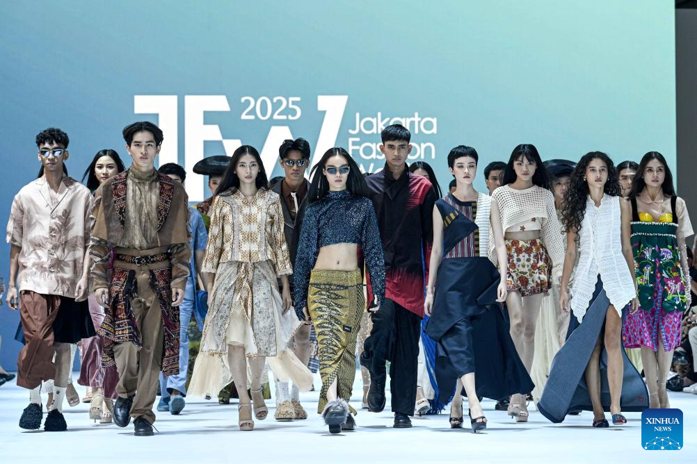 Models present creations during the opening of the Jakarta Fashion Week 2025 in Jakarta, Indonesia, Oct. 21, 2024. (Xinhua/Agung Kuncahya B.)