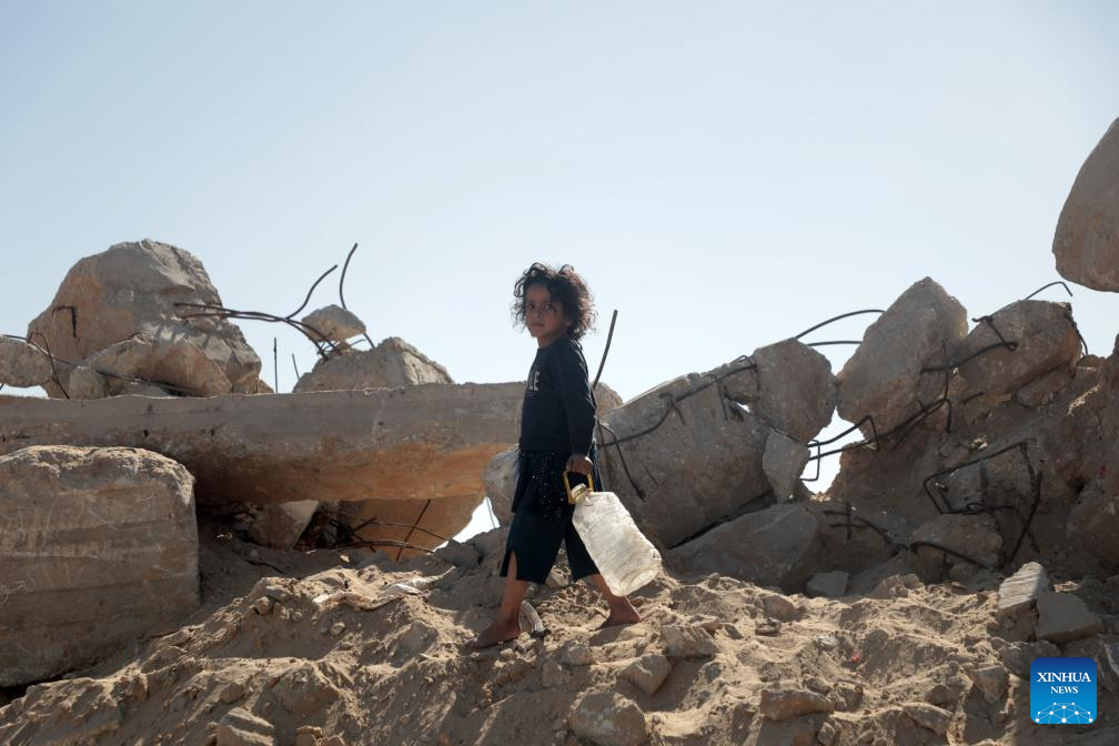 A Palestinian child returns home after filling bottles with water from a vehicle distributing free water in the southern Gaza Strip city of Khan Younis, Oct. 20, 2024. (Photo by Rizek Abdeljawad/Xinhua)