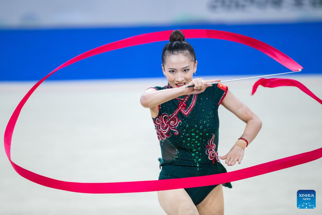 Wang Zilu of team Shaanxi performs during the individual all-around final at the 2024 National Rhythmic Gymnastics Championship in southwest China's Chongqing Municipality, Oct. 21, 2024. (Xinhua/Huang Wei)